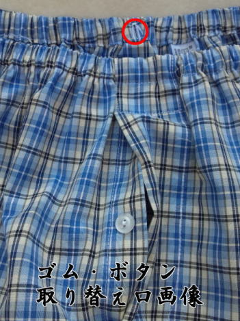 当社の Leトランクス Leジャポン トランクス ロングトランクス には裁断時左図の工夫 を施し背中がずれにくく はきやすいトランクスを 作っております。 また、こちらの製品は ゴムの取り替えも可能 になりました。 |